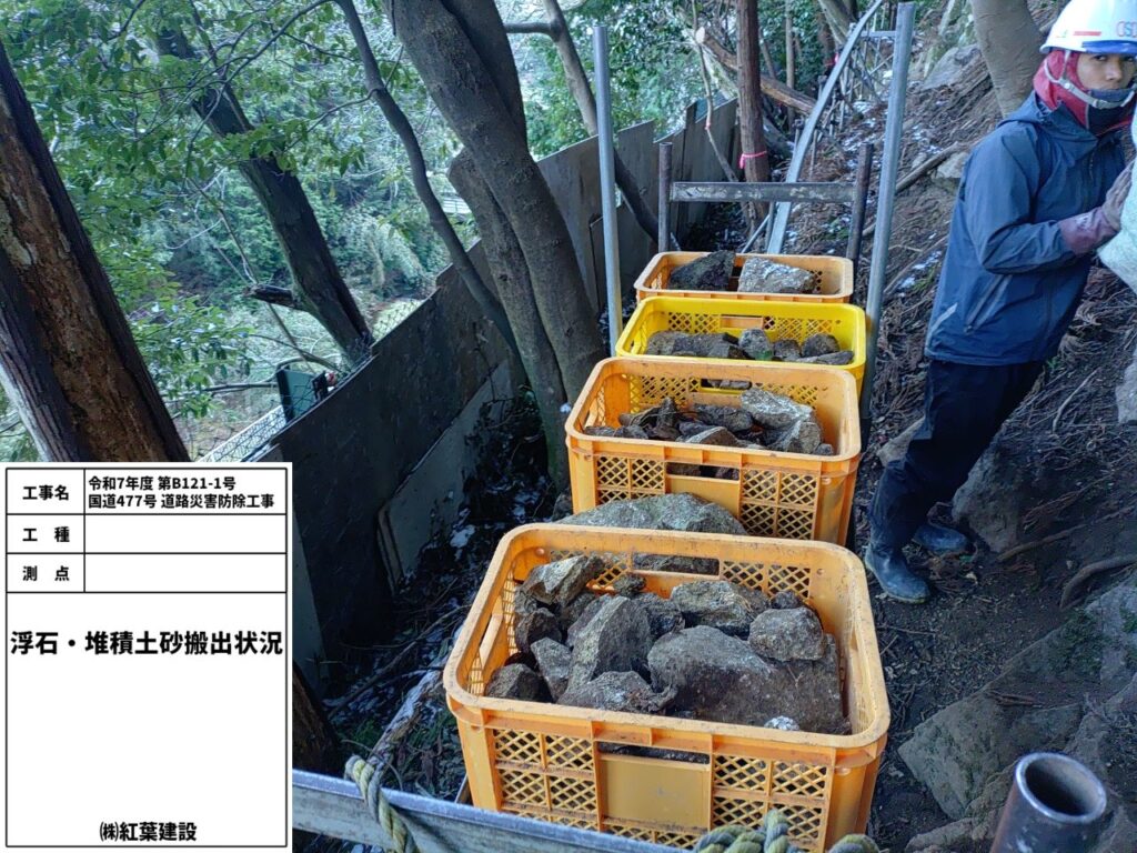 本工事では、岩塊や転石が見られたため、あらかじめ落下の恐れがあるものを取り除きました。現在は、不安定な箇所はなく、安全に施工を進めております。また、万が一に備えて防護柵や防護ネットを設置し、対策を講じております。