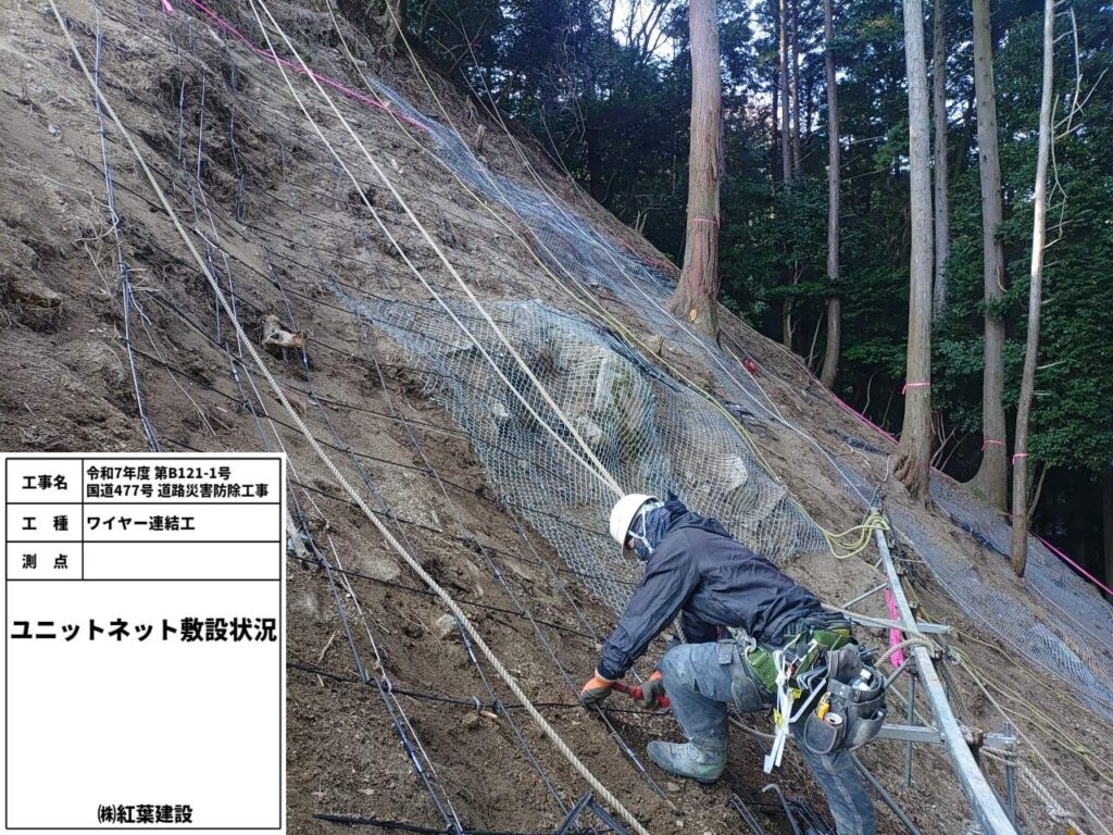 現在、法面の保護対策として、ひし形金網の設置が完了しました。引き続き、ユニットネットの設置を進めています。